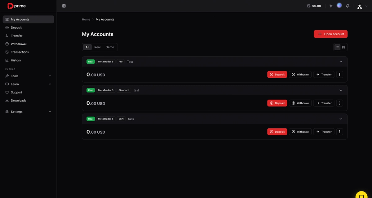 Branded trader portal with self-service account management, fund transfers, trading history, and multi-language support for your forex brokerage clients.