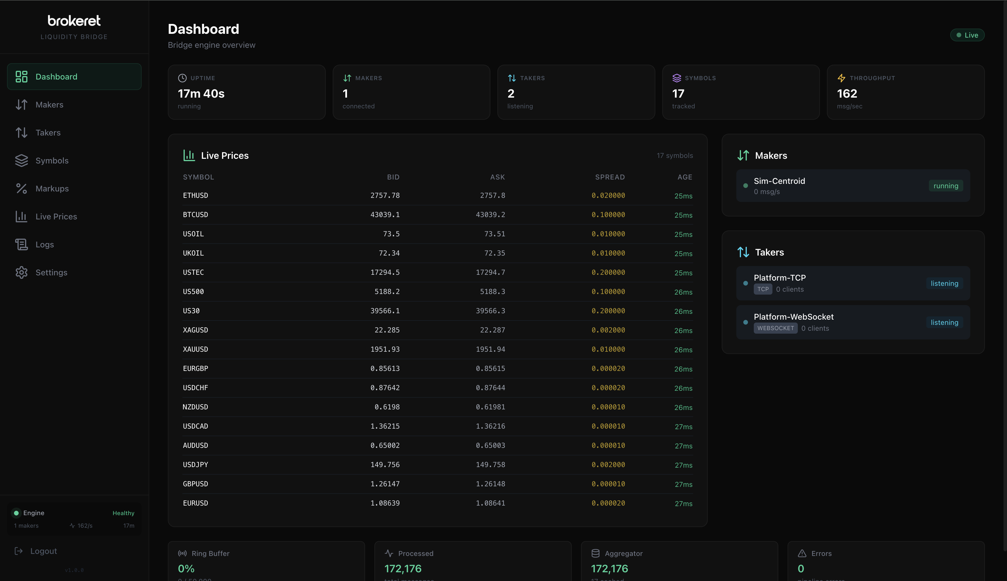 The middleware between your Liquidity Providers and Trading Platforms. Connect multiple LPs via FIX API, aggregate prices, map symbols, apply markups, and distribute to platforms via TCP, WebSocket, or FIX — all from one engine.